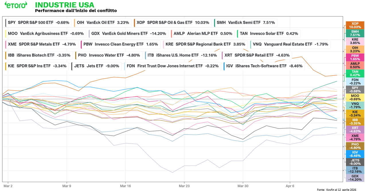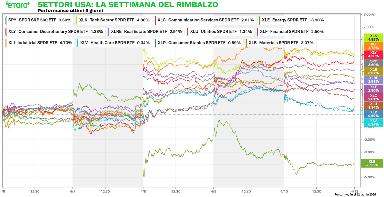 L’energia, che da inizio anno resta il settore leader con circa +30%, nettamente sopra il +17% del comparto materiali, secondo in classifica, chiude invece la settimana della tregua in negativo calo (per la seconda settimana consecutiva). Il principale benchmark del settore (l’ETF XLE) perde il 3,90%. La logica è lineare. Il conflitto Iran aveva incorporato un premio di rischio significativo su petrolio e gas. La tregua ha compresso rapidamente quella componente. Il cessate il fuoco ha spinto il petrolio a scendere di circa il 15% dai picchi, innescando un rally simultaneo su azioni e obbligazioni. Il livello dei prezzi resta comunque elevato e la volatilità potrebbe tornare rapidamente, soprattutto in prossimità della scadenza della tregua del 21 aprile.