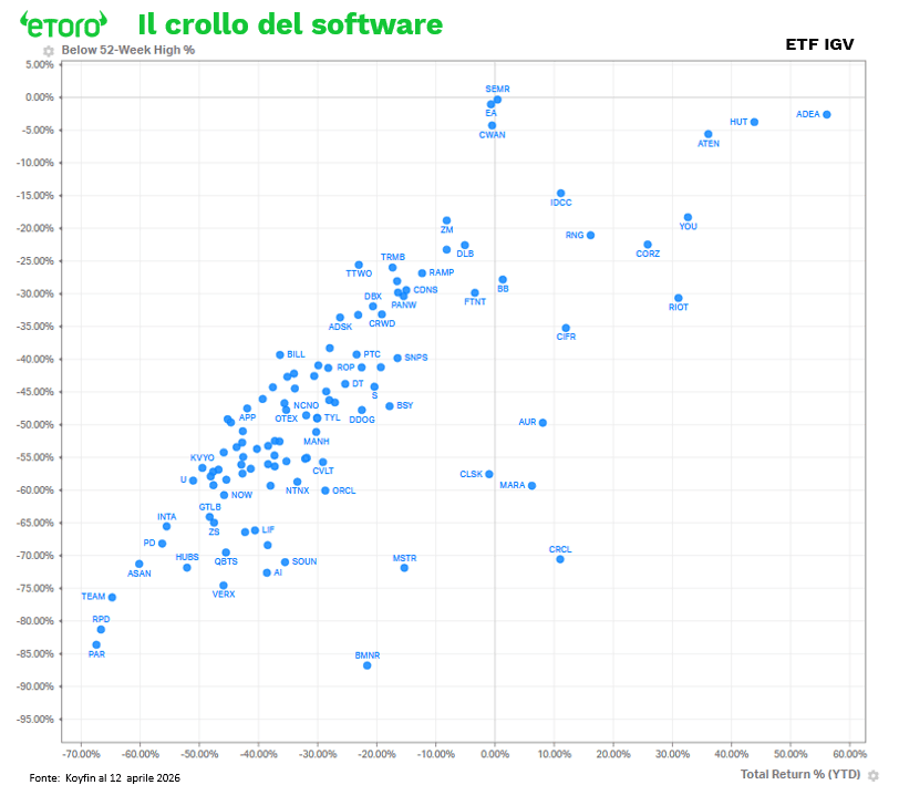 Da questa distribuzione emergono tre narrative molto precise. La prima è che il premio geopolitico sull’energia ha funzionato. XOP e OIH guidano la classifica dal 28 febbraio, segno che il mercato ha sostenuto in particolare le società di esplorazione, produzione e servizi petroliferi. La seconda è la frattura interna alla tecnologia. I semiconduttori (ETF SMH) sale del 7,51% mentre il Software (IGV) perde l’8,46%. Non è una semplice rotazione, è una divergenza strutturale. I dati sui singoli titoli lo confermano. Tra i semiconduttori troviamo Taiwan Semiconductor (TSMC) a +22%, Lam Research (LRCX) a +54% e Applied Materials (AMAT) a +56%. Nel software la situazione è opposta. La maggior parte dei titoli è tra -30% e -65% dai massimi a 52 settimane. È qui uno dei temi centrali del 2026. L’hardware e l’infrastruttura legata all’intelligenza artificiale reggono, il software SaaS soffre in un contesto di tassi elevati e pressione sui capex, ma soprattutto rischio AI (si legga Anthropic).