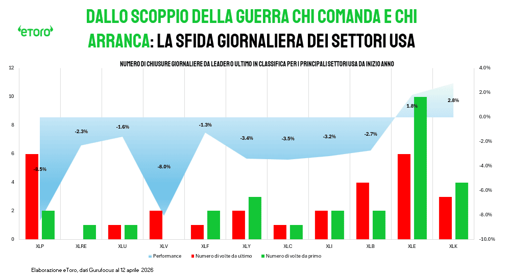 La terza è la più controintuitiva. I difensivi non difendono. Il Consumo di base (XLP) perde il 7,97% e l’Health Care (XLV) il 7,67% dall’inizio del conflitto. In un classico scenario di avversione al rischio avrebbero dovuto sovraperformare. Qui accade il contrario. Questo segnala che il mercato non sta prezzando una recessione tradizionale, ma un contesto più complesso, in cui inflazione e rallentamento coesistono. In uno scenario simile, i titoli con pricing power limitato e valutazioni sensibili ai tassi reali vengono penalizzati su entrambi i fronti.