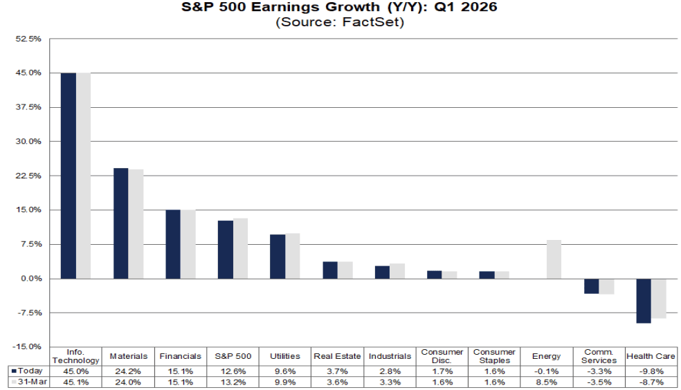 Ma è soprattutto la settimana degli utili a cambiare la natura del mercato. Questa settimana si apre infatti la stagione delle trimestrali negli Stati Uniti. Le attese restano solide, almeno sulla carta. L’S&P 500 è previsto in crescita degli utili del 12,6% su base annua, che segnerebbe il sesto trimestre consecutivo di crescita a doppia cifra. Tecnologia e finanziari restano i principali contributori alla crescita, con il settore tech atteso a +45% sugli utili e i semiconduttori come driver principale. Dall’altro lato revisioni che iniziano a scendere. Nove settori hanno visto tagli alle stime, con particolare pressione su sanitario, consumi discrezionali e staples. E soprattutto un contesto macro che peggiora proprio mentre i multipli restano elevati, con un forward P/E a 21x, sopra le medie storiche degli ultimi 5 e 10 anni.