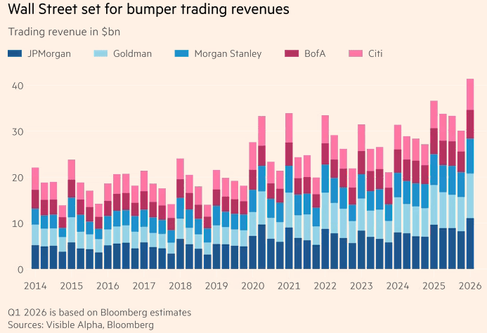 La stagione parte oggi con Goldman Sachs, seguita da JPMorgan, Citigroup, Wells Fargo, Morgan Stanley e Bank of America. Ed è proprio da qui che arriverà il primo vero test. Non tanto sui numeri passati, quanto sulle indicazioni prospettiche. Perché se da un lato la volatilità ha sostenuto i ricavi da trading, con le cinque grandi banche attese sopra i 40 miliardi complessivi, il livello più alto da oltre un decennio, dall’altro lato il mercato cercherà segnali sulla qualità dei ricavi, sulla domanda di credito, sui segnali di stress nei private markets e sulla tenuta del consumatore. È qui che la guerra, ma anche il rischio AI, entra davvero nell’economia reale. Le banche sono il primo punto di trasmissione. Sono loro a vedere se i clienti stanno rallentando, se le aziende stanno rinviando investimenti, se il credito inizia a deteriorarsi. Ed è qui che il mercato cercherà conferme o smentite della narrativa stagflazionistica.