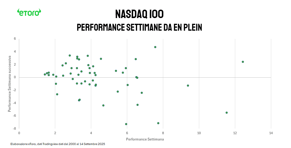 Dal 2000 ad oggi contiamo appena 56 settimane in cui il Nasdaq 100 ha chiuso tutte le sedute in rialzo. In altre parole, approssimativamente meno di una settimana su venti negli ultimi venticinque anni. Eventi rari, concentrati in momenti di forte euforia o di ripartenza ciclica: sei volte nel solo 2017, cinque nel 2024 e già tre nel 2025, mentre in anni di stress come il 2022 non se ne è registrato nemmeno uno. In media questi episodi consegnano un +4,3% nella settimana dell’evento, ma la successiva tende a raffreddarsi: la media scivola a -0,05% e la mediana si ferma a +0,39%. La dimensione del movimento fa poi la differenza: quando l’en plein è moderato (meno del 2%), come l’ultimo +1,86%, la prosecuzione è stata storicamente più probabile, con tutti i cinque casi comparabili seguiti da un’altra settimana positiva. Al contrario, quando il guadagno settimanale ha superato il 5%, la settimana dopo ha mostrato in media un rientro di circa l’1,1%. Il segnale di momentum è quindi sì reale, ma la sua fragilità cresce con l’ampiezza del rally. L’ultimo episodio, proprio perché contenuto, statisticamente favorisce una continuazione moderata più che un accelerazione. Ma questa è solo statistica.