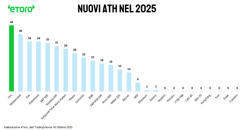 A confronto, lo S&P 500 ne ha segnati 33, il Nasdaq 100 trentuno, lo Stoxx 600 diciotto, il DAX trentaquattro. Persino Bitcoin si ferma a tredici, Nvidia a ventisei. Neanche Leonardo, Rheinmetall o Robinhood riescono a tenere il passo.