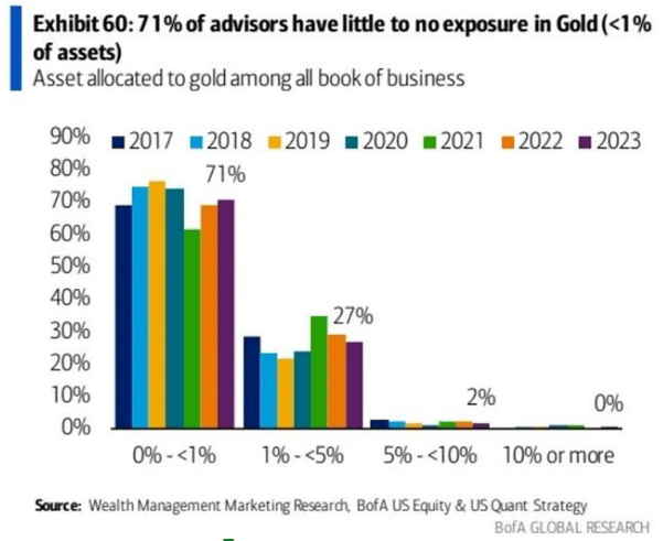 E pensare che tra il 2011 e il 2019 il metallo giallo era stato dimenticato. Nessun nuovo massimo per quasi un decennio, un drawdown del 44% e una raccomandazione quasi unanime tra i consulenti: “non più dell’1% del portafoglio”, riportava Bank of America tra il 2017 e il 2023.