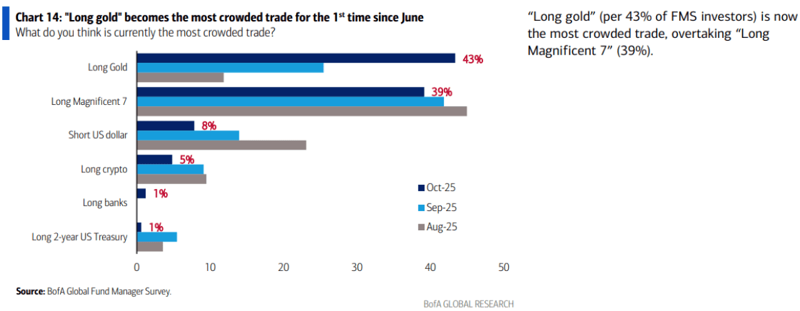 Oggi lo scenario è capovolto. Nel sondaggio mensile di ottobre del BofA Global Fund Manager Survey, il “long Gold” (43%) è diventato il trade più affollato, superando persino la scintillante aura delle Magnifiche 7 (39%). Un ritorno che non sorprende del tutto. Già tra aprile e giugno 2025 l’oro aveva guidato la classifica con punte del 58%, prima di cedere temporaneamente al “short dollar” e all’hype tecnologico. Ora però, il metallo rifugio torna protagonista assoluto. Dopo la febbre per le Magnifiche 7, è tornata la febbre dell’oro.