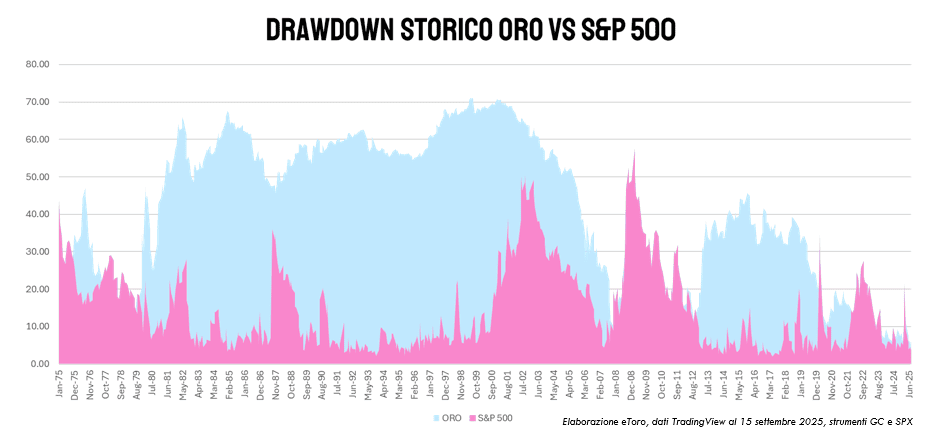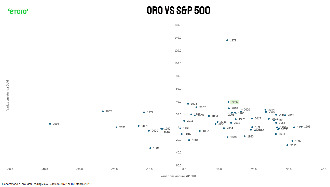 Sono fiammate che ricordano più un’opzione convessa che un bene rifugio: non reagisce sempre, ma quando esplode diventa dominante. Tuttavia, dopo i grandi rally lascia spesso dietro di sé lunghi deserti di performance.