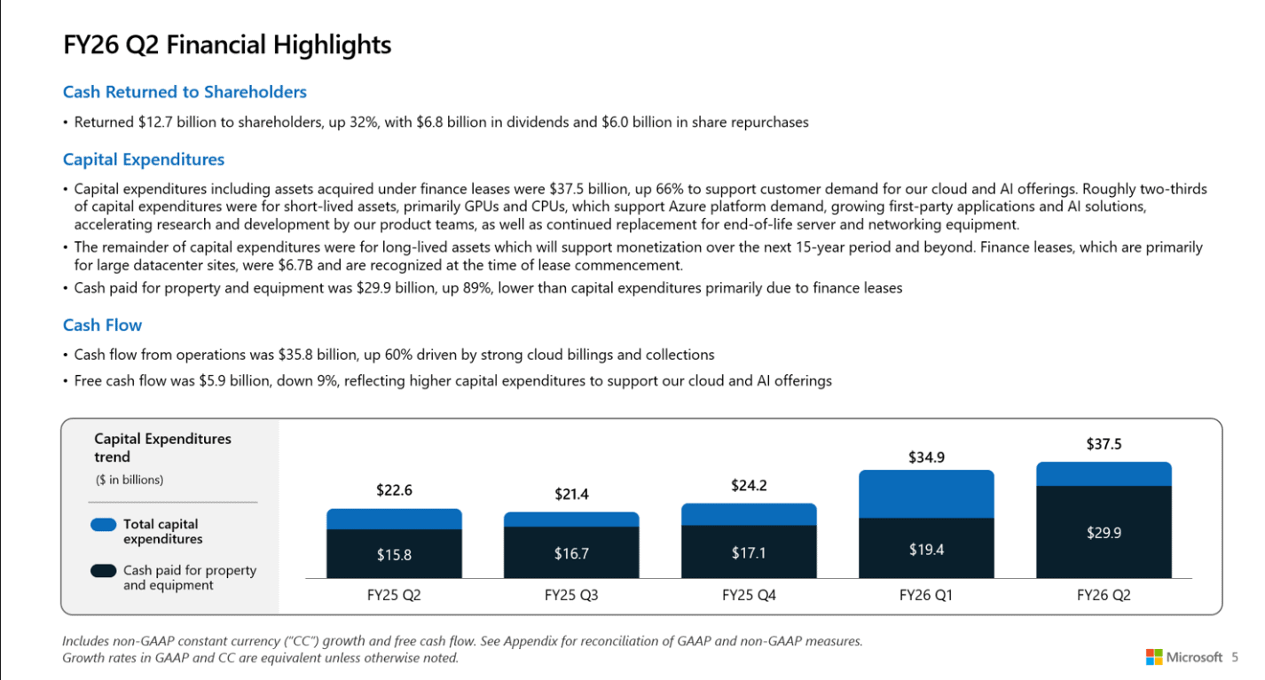 Ma l’attenzione del mercato si è spostata su un dettaglio che dettaglio non è. Le spese in CapEx trimestrali sono salite a $37,5 miliardi, e circa due terzi sono concentrati su asset a vita breve, GPU e CPU, cioè infrastruttura che invecchia rapidamente. CapEx, per un investitore retail, significa spesa in data center, chip, capacità computazionale. È il motore dell’AI, ma è anche ciò che può comprimere i margini e assorbire cassa nel breve. Non a caso il free cash flow è sceso a $5,9 miliardi nel trimestre, proprio per l’aumento della cash CapEx e per la dinamica dei leasing.