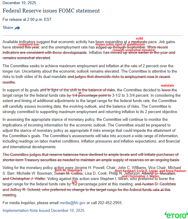 La decisione della Fed si è svolta senza eventi, come previsto. Un meeting che, sulla carta, è stato uno dei più prevedibili. Tassi invariati al 3,50%-3,75%, nessun dot plot, nessun cambio di rotta formale. Eppure, sotto la superficie, il messaggio è stato più articolato di quanto possa sembrare a una prima lettura.