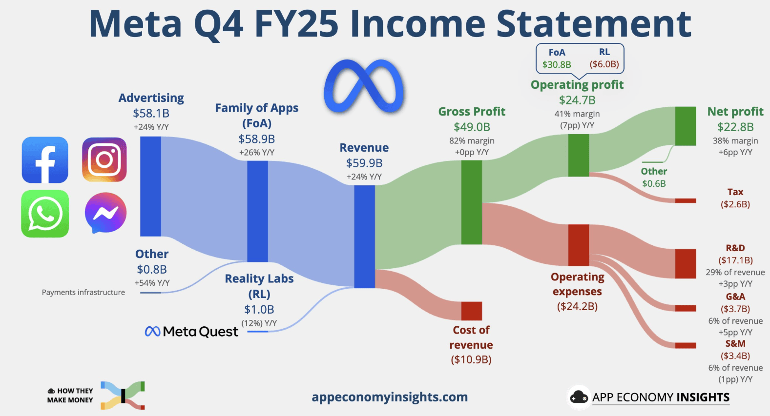 Meta ha presentato la stessa grammatica, ma con una sintassi diversa. Ricavi (record) a $59,9 miliardi, +24% a/a, utile netto a $22,8 miliardi. I costi sono esplosi, spese totali a $35,1 miliardi, +40% a/a, con una narrativa chiara su AI talent, legale e infrastruttura. Eppure, il margine operativo resta impressionante, al 41% nel trimestre.