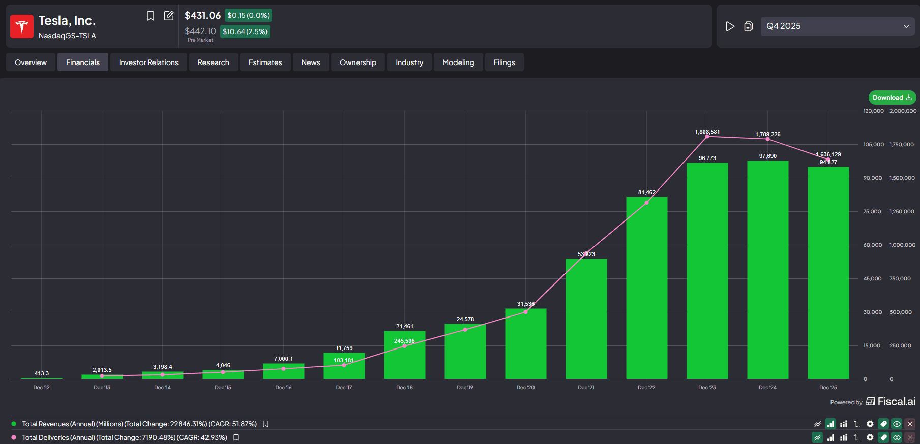 Tesla è, invece, un capitolo diverso, perché qui la trimestrale non è stata solo un aggiornamento sui numeri, ma una dichiarazione esplicita di cambio di identità. Nel quarto trimestre del 2025 l’azienda ha battuto le attese su utili e ricavi, con un EPS non GAAP a $0,50 contro $0,45 stimati e ricavi a $24,9 mld, leggermente sopra le previsioni. Il mercato ha reagito positivamente nell’immediato. Ma fermarsi al beat significa perdere il quadro più ampio.