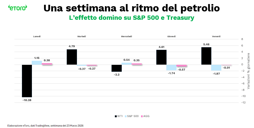 Perché quello che emerge con forza è che non esiste più una vera diversificazione classica. Nella scorsa settimana, ogni variazione del prezzo dell’energia si è riflessa contemporaneamente su azioni e obbligazioni. Quando il petrolio sale, aumenta la pressione inflattiva e i mercati si irrigidiscono, quando scende, si muovono i rendimenti reali e le azioni reagiscono. Non è più una relazione indiretta, è una trasmissione immediata.