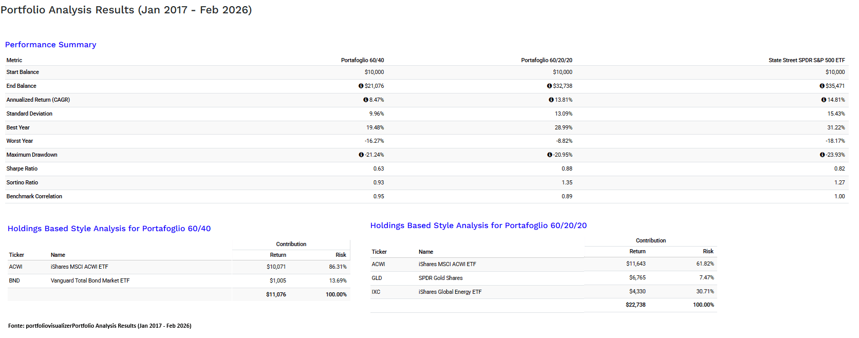 Il portafoglio classico 60% ACWI (azionario internazionale) + 40% BND (obbligazionario internazionale) ha generato un rendimento annualizzato (CAGR) del 8,47%, con una volatilità del 9,96% e un massimo drawdown del 21,24% (recuperato in 18 mesi). Ha catturato solo il 57,7% dell’upside del benchmark S&P 500, pur mantenendo una correlazione molto elevata (0,95). Il benchmark S&P 500 (SPY) ha reso il 14,81% annualizzato nello stesso periodo, con drawdown massimo del 23,93%. Il 60/40 ha funzionato discretamente in un mondo dominato da shock di domanda (dove le banche centrali potevano intervenire tagliando i tassi). Ma nel nuovo contesto di shock di offerta ripetuti le obbligazioni non proteggono più dall’inflazione e dalla crescita dei rendimenti reali. Il rischio rimane concentrato quasi esclusivamente sull’equity (86% della volatilità totale del portafoglio deriva da ACWI).