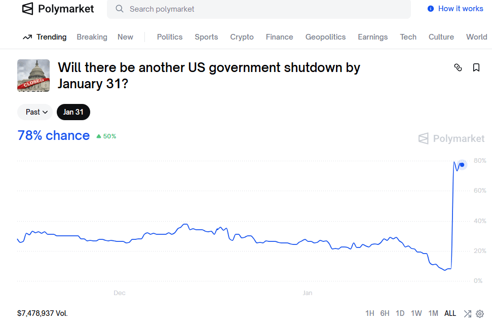 Il secondo fronte è politico e istituzionale. Negli Stati Uniti le tensioni interne si intensificano, con senatori democratici pronti a bloccare il funding bill per il Department of Homeland Security su riforme e agenzie come ICE, dopo una sparatoria fatale che ha coinvolto un agente della Border Patrol. Con l’avvicinarsi delle scadenze di finanziamento, cresce il rischio di un partial government shutdown, che i mercati prezzano con una probabilità del 77% (dati polymarket). A questo si aggiungono altri fattori di instabilità: il rischio di un’escalation con l’Iran, l’indagine del DOJ sul Fed Chair Powell, l’ipotesi che il CIO di BlackRock possa diventare il prossimo Chair della Fed, e Trump che torna a invocare assegni di stimolo da 2.000 dollari e tassi all’1%. Il messaggio che arriva ai mercati è quello di un quadro politico sempre più rumoroso e sempre meno prevedibile.