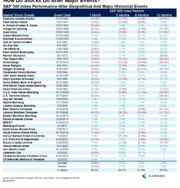 Un’analisi di Goldman Sachs sui conflitti in Medio Oriente dal 1991 mostra che questi eventi producono in media una correzione dell’S&P 500 di circa il 6% distribuita su poco più di due settimane, seguita da un recupero. Carson Investment Research, osservando i conflitti dal 1940, evidenzia una dinamica simile. Nel primo mese dall’inizio delle ostilità l’indice registra una flessione media dello 0,9%, ma nei successivi tre, sei e dodici mesi i rendimenti tornano positivi.