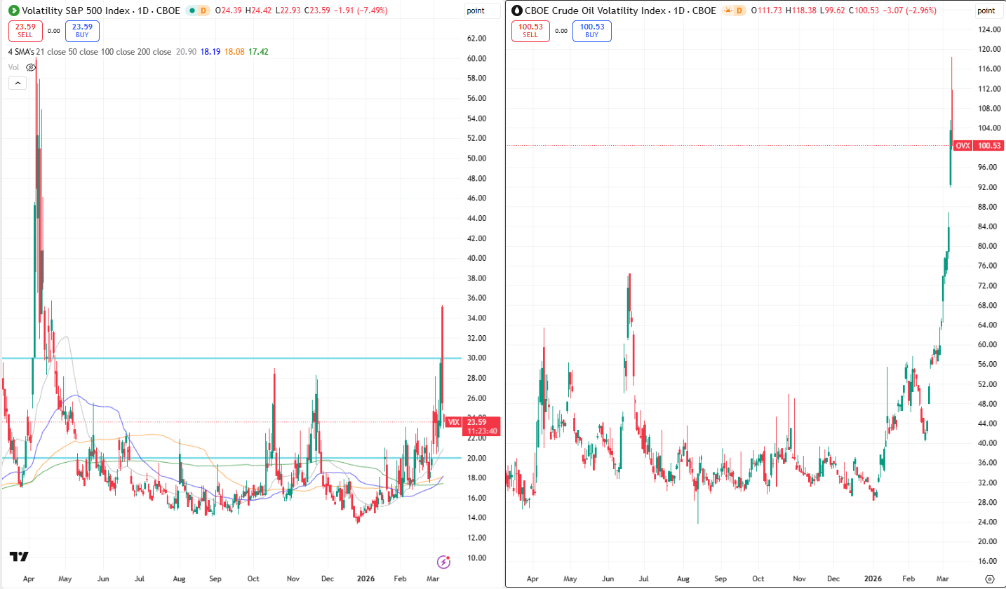 La volatilità lo racconta meglio di qualsiasi indice. A fine febbraio il VIX, l’indice che misura la volatilità implicita sull’S&P 500, scambiava intorno ai 19,9 punti. Nelle ore più tese è arrivato a superare quota 35 prima di ritracciare verso area 25. Lo stesso schema si è visto sulle materie prime. L’OVX, l’indice di volatilità del petrolio, è passato da circa 64 punti a oltre 118 (attualmente a 100 punti), segnale di un mercato energetico improvvisamente costretto a prezzare scenari estremi.