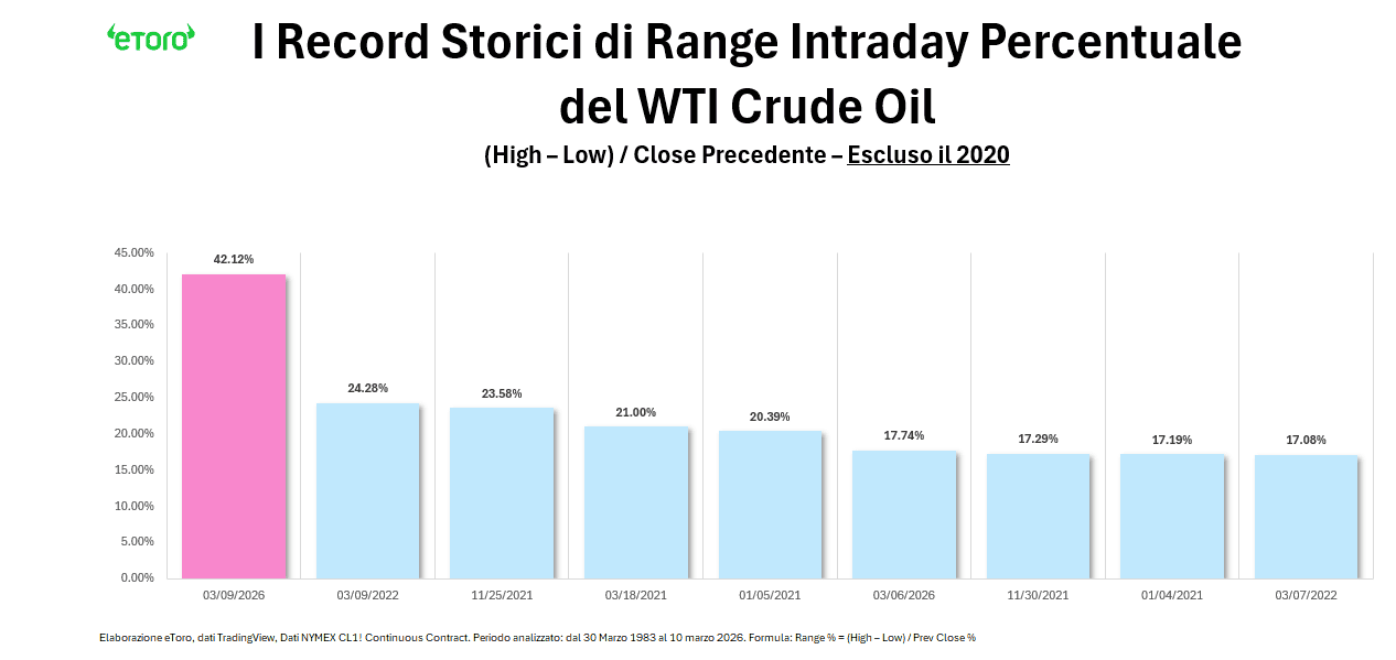 La seduta di ieri sul petrolio è stata quasi un caso da manuale. Il WTI ha registrato un’escursione intraday del 42,12%, con un massimo a 119,48 dollari e un minimo a 81,19 rispetto alla chiusura precedente a 90,90. Un movimento che, escluso il 2020, è il più estremo della serie storica dal 1983.