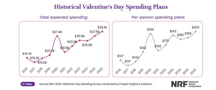 Negli Stati Uniti, San Valentino 2026 muoverà 29,1 miliardi di dollari, in crescita del 5,8% sul 2025. La spesa media per persona tocca 199,78 dollari, superando anche il picco pandemico del 2020. Ma c’è un dettaglio che ribalta la narrazione romantica: nel 2025 gli americani hanno speso 259 dollari per la Festa della Mamma e 199,38 per quella del Papà. San Valentino arriva terzo. La gerarchia affettiva è matematica: prima i genitori, poi il partner.