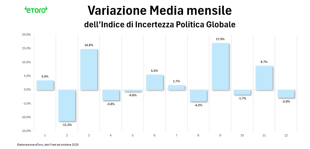 Per orientarsi, vale la pena tornare ai numeri. Guardando alla serie storica dell’indice di incertezza politica globale, il GEPU, dal 1997 fino a ottobre 2025, emerge un pattern stagionale tutt’altro che banale. Gennaio è storicamente un mese di risveglio dell’incertezza, con una variazione media positiva di circa +3,4% rispetto a dicembre. Spesso è il preludio a un primo trimestre nervoso, con marzo che storicamente rappresenta il vero punto di stress, registrando una variazione media del +14,8%. Allo stesso tempo, febbraio tende a offrire una tregua statistica, con un calo medio dell’indice pari a circa -11%. La domanda aperta è se questa ciclicità reggerà anche quest’anno, in un contesto in cui i livelli di incertezza nel 2025 si sono assestati su valori strutturalmente più elevati rispetto al passato, o se le variabili esogene finiranno per rompere lo schema.