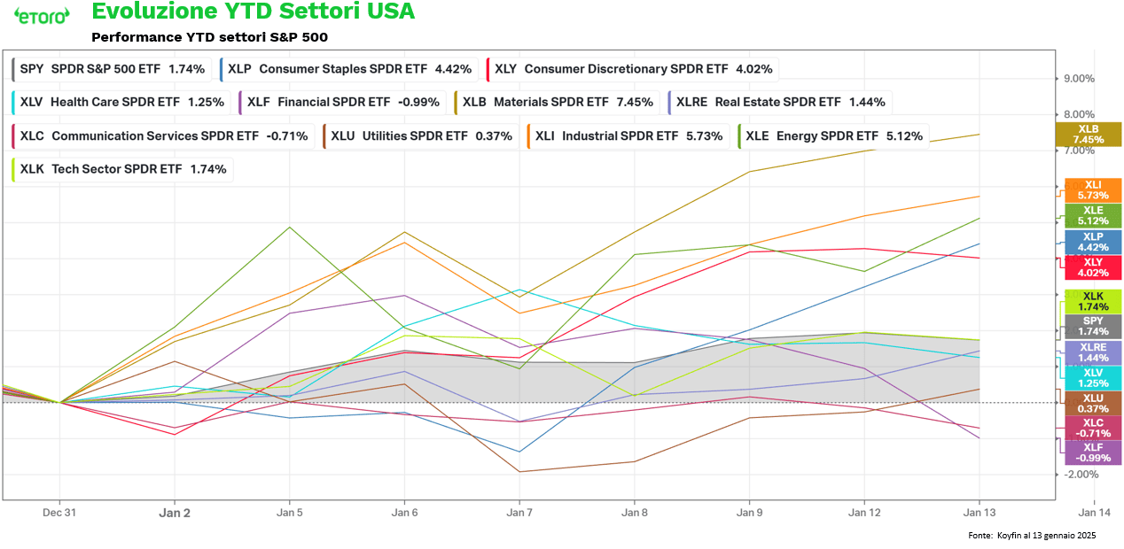 La seduta di ieri ha mostrato un fisiologico rifiatare, con l’S&P 500 a -0,2% e lo Stoxx 600 a -0,1%. Una pausa tecnica, più che un cambio di tono, arrivata nonostante e non a causa dei dati sull’inflazione americana. Interessante la lettura interna del movimento. I settori ciclici statunitensi hanno corretto, con il comparto bancario sotto pressione dopo le trimestrali e le revisioni legate alle decisioni di Trump sui tassi delle carte di credito. Sotto la superficie, però, la rotazione dal Tech verso i ciclici value continua. Industriali e materiali restano tra i segmenti che sovraperformano il mercato più ampio.