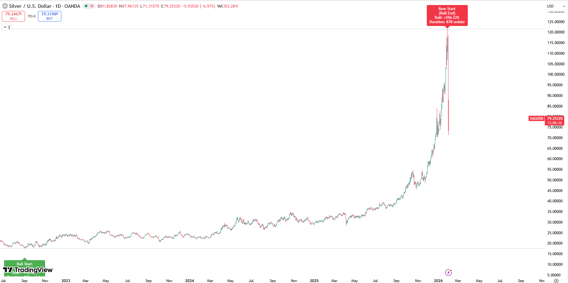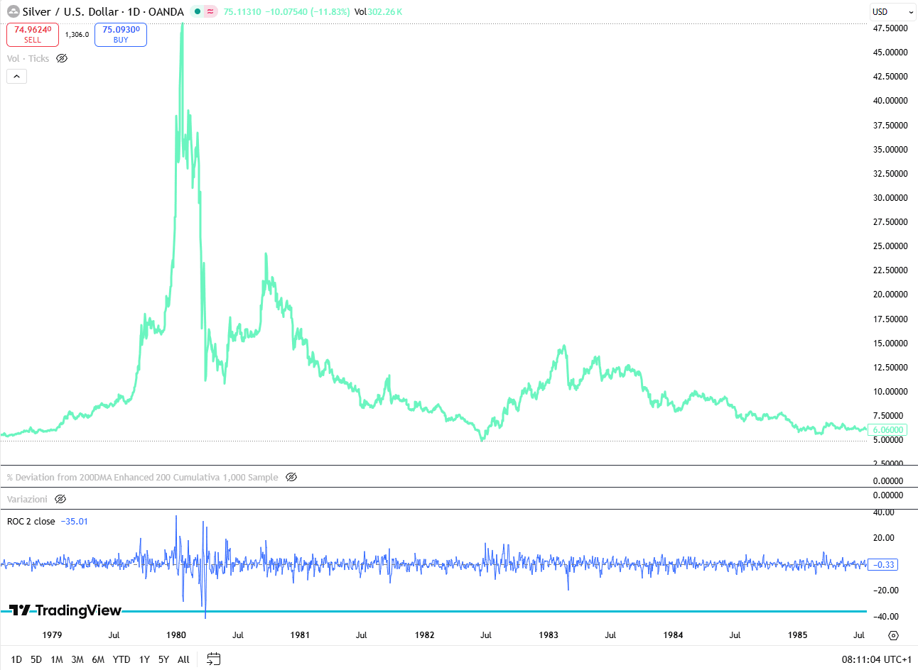 In entrambi i casi, la dinamica dei prezzi aveva assunto una forma chiaramente iperbolica. Quando i prezzi si allontanano in modo così marcato dalle medie di riferimento, il mercato smette di essere guidato dai fondamentali e diventa terreno di posizionamenti tattici, leva finanziaria e inseguimento del momentum. È una fase in cui la narrativa sostiene il movimento, ma la struttura è fragile. Basta un catalizzatore, anche marginale, per innescare una correzione violenta. Non a caso il Rate of Change a 2 giorni, al momento di stesura di lunedì mattina, ha raggiunto circa -35 punti, un livello che non si osservava dalla fine di marzo 1980. In termini statistici, questi numeri non descrivono una normale correzione, ma una fase di stress da liquidazione.