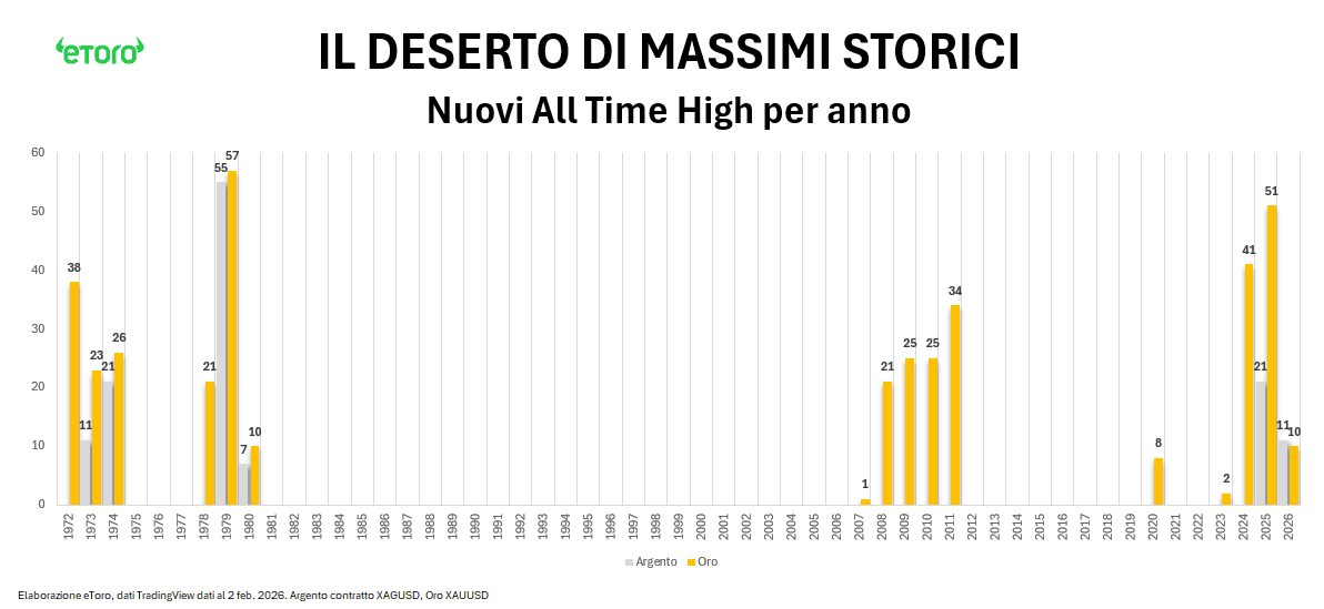 A rendere ancora più significativa questa fase è la distribuzione storica dei massimi. I nuovi All Time High su oro e argento non sono eventi regolari, ma fortemente concentrati nel tempo. Il grafico dei nuovi massimi per anno mostra lunghi periodi di assenza di record, veri e propri deserti, interrotti da finestre brevi e intense in cui i massimi si accumulano a ritmo serrato. Gli anni Settanta, il ciclo post-2008 e l’ultima fase ne sono esempi evidenti. Quando il regime di mercato cambia, i massimi smettono di essere eccezioni e diventano la normalità. È in queste fasi che si costruiscono i grandi bull market, ma anche gli eccessi che rendono inevitabili correzioni violente lungo il percorso. L’argento, storicamente, amplifica questi movimenti con una dinamica più episodica e speculativa.
