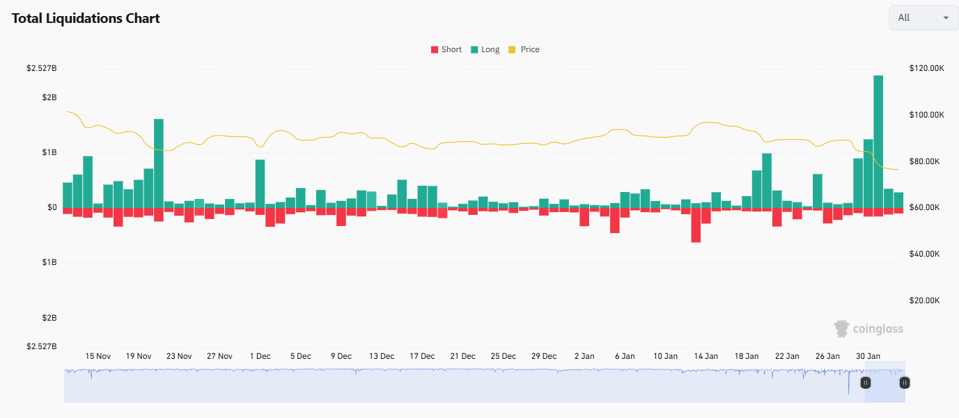 Le liquidazioni di posizioni lunghe negli ultimi giorni di gennaio hanno superato i 4,5 miliardi di dollari, con un picco superiore ai 2,4 miliardi in sole 24 ore. Si tratta di un classico pattern da long squeeze: un calo iniziale innesca stop-loss e margin call, generando vendite forzate che amplificano il ribasso in una cascata.