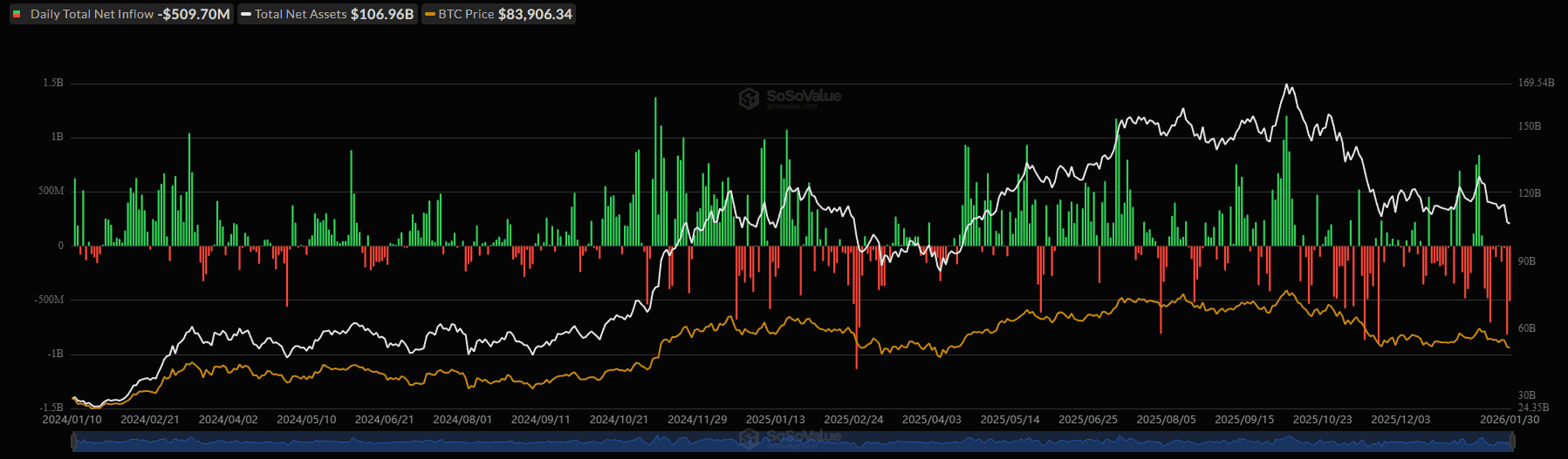 Nel frattempo, gli ETF spot su Bitcoin hanno registrato deflussi netti significativi: gennaio si chiude con 1,61 miliardi di dollari in uscita, proseguendo il trend negativo già visto a dicembre e novembre. L’ultima settimana ha segnato addirittura 1,49 miliardi di deflussi, un valore così marcato che non si registrava dal 28 febbraio 2025, con gli ultimi quattro giorni del mese che da soli hanno visto circa 1,494 miliardi uscire dagli ETF. Senza il sostegno costante degli investitori istituzionali, il prezzo spot è diventato più fragile, esposto a liquidità sottile e grandi ordini di vendita.