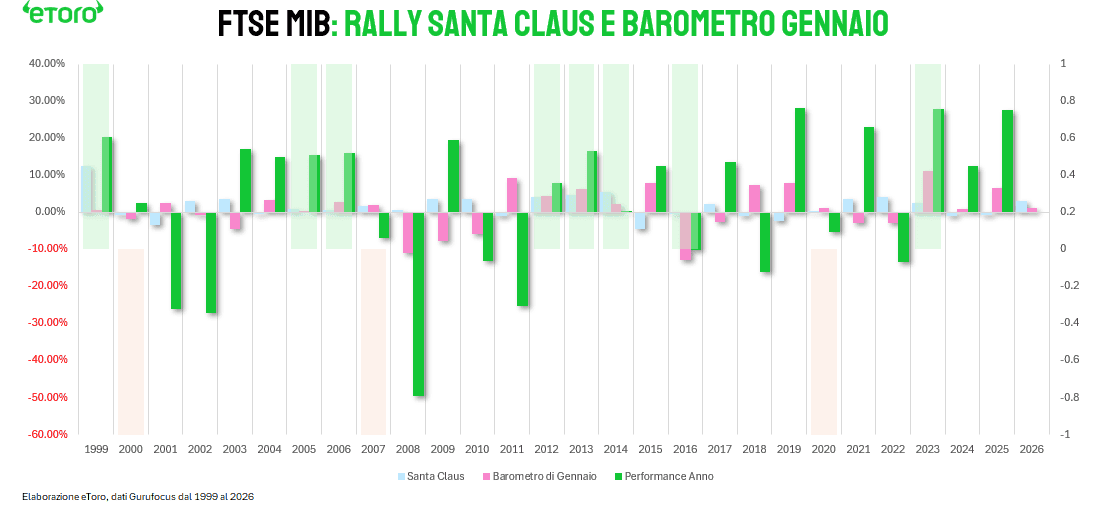Anche i segnali stagionali vanno letti in questa chiave. Il Rally di Santa Claus è stato positivo, +3,11%. Il Barometro di Gennaio segna +1,30%. Presi singolarmente sono indicatori imperfetti, ma storicamente la loro combinazione riduce la probabilità di un anno fortemente negativo. Non indicano un percorso lineare, ma un contesto in cui il rischio sistemico resta contenuto e la dispersione tende a rimanere elevata.