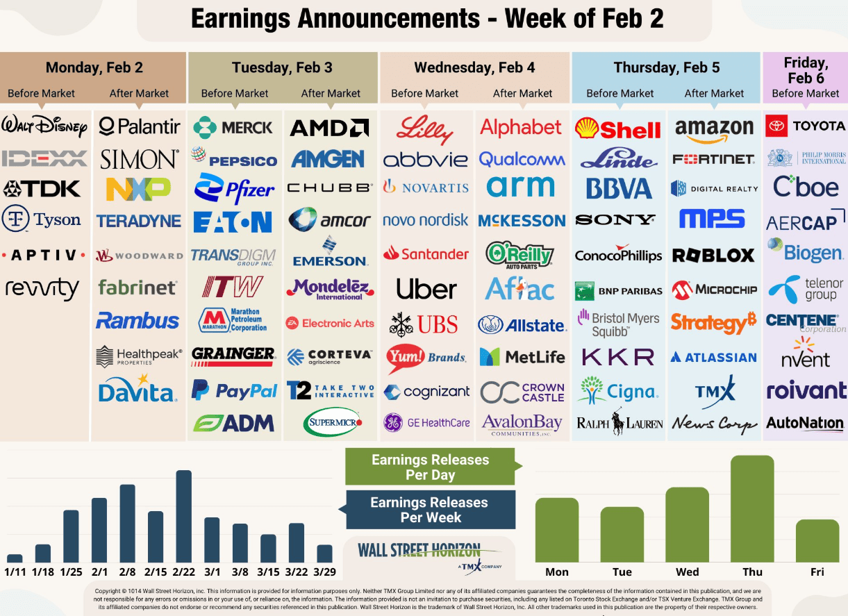 La settimana sarà punteggiata anche da eventi extra-finanziari: giovedì prende il via il Sei Nazioni (rugby) con Francia Irlanda a sfidarsi allo Stade de France di Parigi; venerdì cerimonia di apertura delle Olimpiadi Invernali Milano-Cortina, nel weekend il Super Bowl, oltre alle elezioni politiche in Giappone (domenica 8, snap election dal sapore imprevedibile) e in Thailandia.