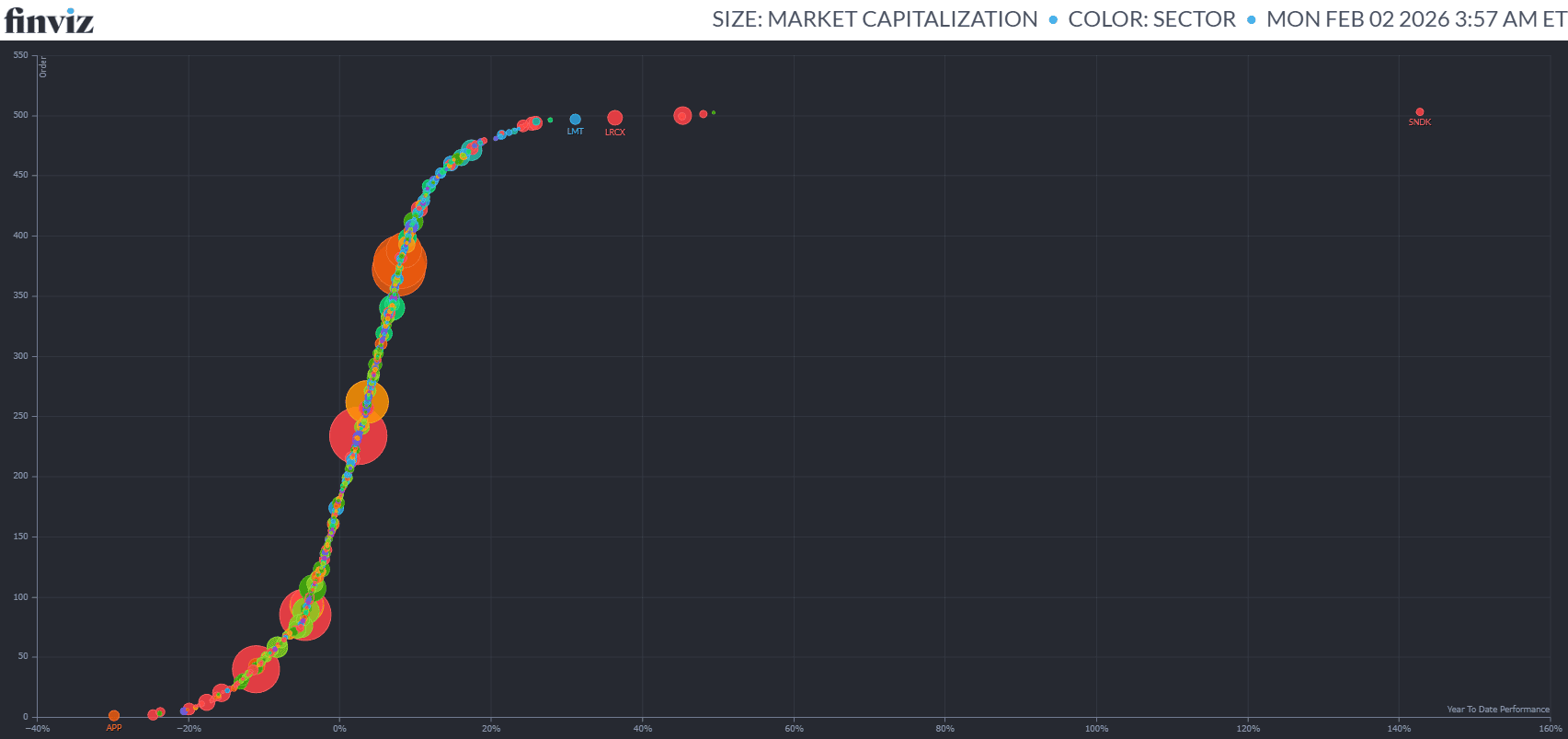 Passando al mercato azionario, negli Stati Uniti, l’S&P 500 chiude gennaio come il miglior mese da ottobre, ma anche qui la lettura headline è ingannevole. La partecipazione è ampia, 319 titoli in rialzo e 180 in ribasso, ma la leadership è fortemente concentrata. Tra i migliori titoli figurano Sandisk, Moderna e Seagate, seguite da Micron. In coda AppLovin, Intuit, Humana e ServiceNow. È una rotazione netta, memoria e hardware contro software e servizi, coerente con una fase di revisione delle aspettative di crescita e con una maggiore attenzione al ciclo degli investimenti reali rispetto alle promesse di crescita futura.