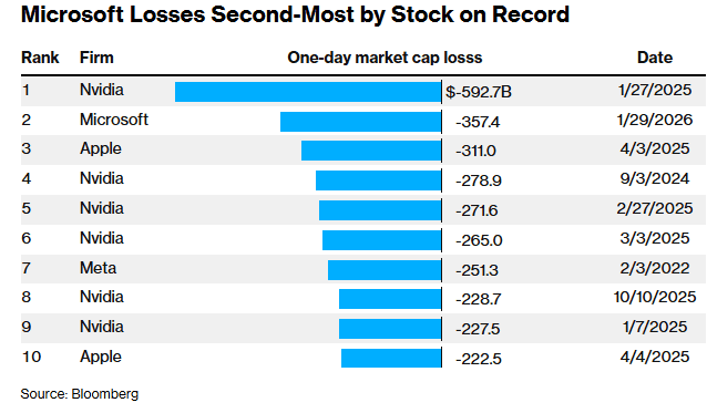 Un catalizzatore di questa divergenza è stata certamente anche la seduta di ieri, quando Microsoft ha riportato numeri formalmente impeccabili, con fatturato e utili sopra le attese, ma ha innescato un crollo verticale del 10% in una sola sessione, la peggior performance giornaliera dal marzo 2020, con una capitalizzazione evaporata di 357 miliardi di dollari, la seconda peggiore della storia borsistica americana dopo quella subita da Nvidia ai tempi dell’impatto DeepSeek, così come la peggiore in assoluto per l’azienda di Redmond.