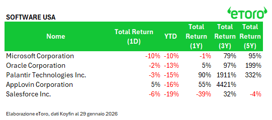 Gli investitori non hanno perdonato la decelerazione della crescita di Azure, scesa sotto le aspettative nonostante i record assoluti, e soprattutto l’esplosione delle capex in AI, con miliardi spesi in infrastrutture cloud che dipendono pesantemente da un solo grande cliente come OpenAI e che non stanno ancora generando quel ritorno incrementale capace di giustificare i multipli. Questo sell-off ha contagiato l’intero comparto software: ServiceNow ha ceduto quasi il 10% nella stessa giornata, e l’effetto a catena ha pesato sul nostro portafoglio Software USA, dove Microsoft rappresenta un quinto dell’esposizione equiponderata, aggravato dalla volatilità di Palantir e da un Salesforce e Oracle alle prese con una competizione sempre più feroce.