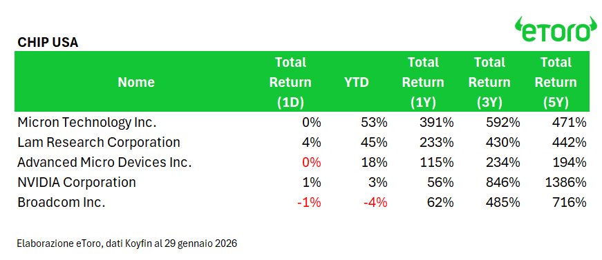 Il risultato è tuttavia un portafoglio europeo a +28,64% che continua a battere il CHIP USA (+22,84%), dove la forza straordinaria di Micron (+52,69% YTD, trainata dal boom HBM e DRAM per AI training) e Lam Research (+44,98%) ha compensato ampiamente la relativa cautela su Nvidia (+3,22%) e il lieve rosso di Broadcom (-4,44%), con AMD che tiene solido a +17,75% grazie alla quota crescente in data center CPU e GPU. Non si tratta di delusioni diffuse, ma di una naturale stabilizzazione per i leader del computing puro dopo il run epico 2024-2025, con il mercato che inizia a prezzare un ritorno più normale.