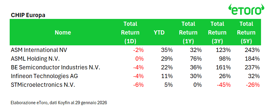 I portafogli semiconduttori riflettono questa stessa logica, ma con una rotazione interna che premia segmenti specifici del ciclo: il CHIP Europei beneficiano della sovraperformance assoluta di ASML, che ha toccato nuovi massimi storici dopo ordini record per macchine EUV da TSMC, Intel e Samsung, con un book-to-bill ben sopra 1,5 e guidance 2026-2027 che prevede crescita annua del 25-30%. Il tutto nonostante una seduta di ieri che ha visto il passo falso di Infineon (-3,7%) e soprattutto di STMicroelectronics (-5,7%, dopo la pubblicazione dei conti per il quarto trimestre).