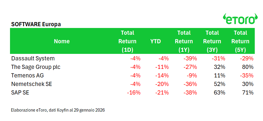 In Europa la batosta è stata ancora più pesante: SAP ha perso circa il 16% dopo un outlook debole sul cloud enterprise, alimentando timori concreti che gli strumenti di coding AI stiano erodendo il core business tradizionale; il portafoglio Software UE, già penalizzato da una macroeconomia più fragile con energia costosa e regolamentazione stringente su dati e privacy, ha accusato il colpo in modo amplificato, con Dassault Systèmes, Sage, Nemetschek e Temenos che non sono riusciti a controbilanciare la debolezza del leader tedesco, anzi hanno ieri tutte chiuso in negativo.