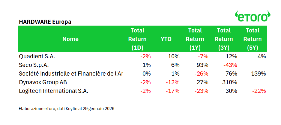 L’Hardware UE resta il grande deluso, con una performance del -1,76%, e conferma una difficoltà strutturale del continente a intercettare il mega-ciclo legato ad AI e data center. Logitech, pur restando il nome più rappresentativo del paniere, è il principale freno con un -17,39%, penalizzato da una domanda debole su dispositivi per l’utenza finale in una fase in cui l’attenzione del mercato si è spostata in modo netto verso l’infrastruttura enterprise. Dynavox segue in negativo a -11,62%, riflettendo i limiti di una nicchia altamente specializzata come l’assistive technology, che rimane sostanzialmente scollegata dai principali driver dell’AI. Sul fronte opposto, Quadient mostra una tenuta relativa a +9,81%, sostenuta dall’esposizione all’automazione fisica nei segmenti mailing e logistics, stabili ma lontani dal boom hyperscaler. Seco registra una moderata resilienza a +6,14%, intercettando solo in modo marginale i trend dell’IoT industriale embedded, mentre Société Industrielle et Financière de l’Artois resta sostanzialmente invariata a +0,58%. Il risultato è un portafoglio che si muove intorno alla parità, offrendo una fotografia molto chiara della frammentazione europea. Mancano campioni globali con scala e leva diretta sul build-out infrastrutturale statunitense, e le nicchie profittevoli, pur difensive, non sono sufficienti a compensare l’assenza di esposizione ai veri motori del 2026, storage, server e infrastruttura AI su larga scala.