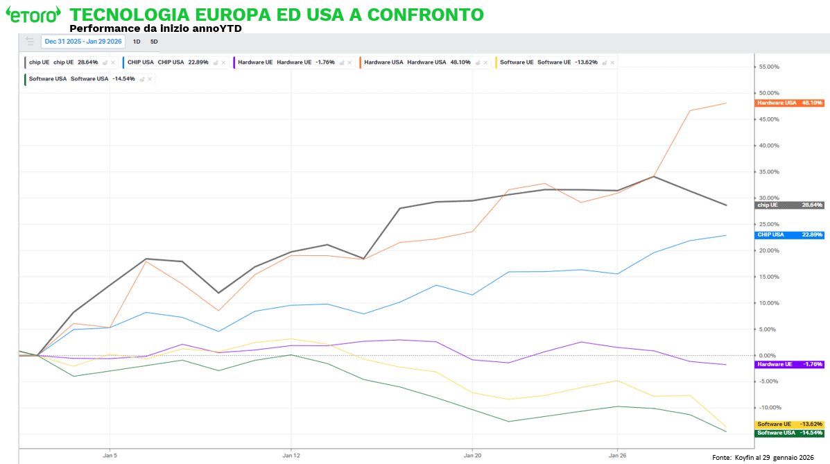 Il risultato è una dispersione estrema, con l’Hardware USA in rialzo di circa +48,10%, contro il -14,54% del Software USA e il -13,62% del Software UE, una forbice che sintetizza meglio di qualsiasi commento quanto il mercato stia oggi premiando la scarsità fisica e punendo l’incertezza del ritorno sugli investimenti.
