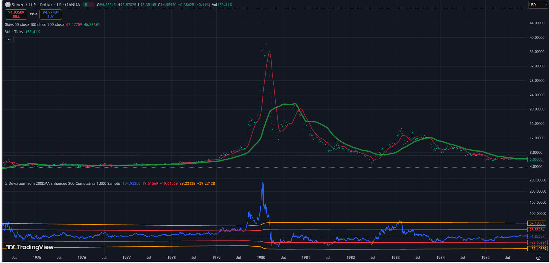 Il parallelo storico con il 1980 e i fratelli Hunt è d’obbligo, ma va letto con occhi moderni. Il riferimento non è nostalgia, è statistica. È l’unico periodo che mostra uno scostamento percentuale dalla media di lungo periodo superiore a quello attuale (in quel momento si toccarono quasi il 250%).