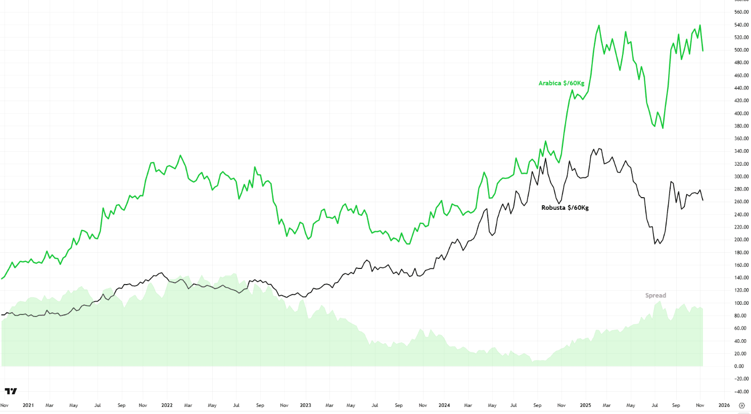 La divergenza tra i due segmenti ha riaperto lo spread storico a favore dell’Arabica, riportando il differenziale tra le due varietà sui massimi triennali.