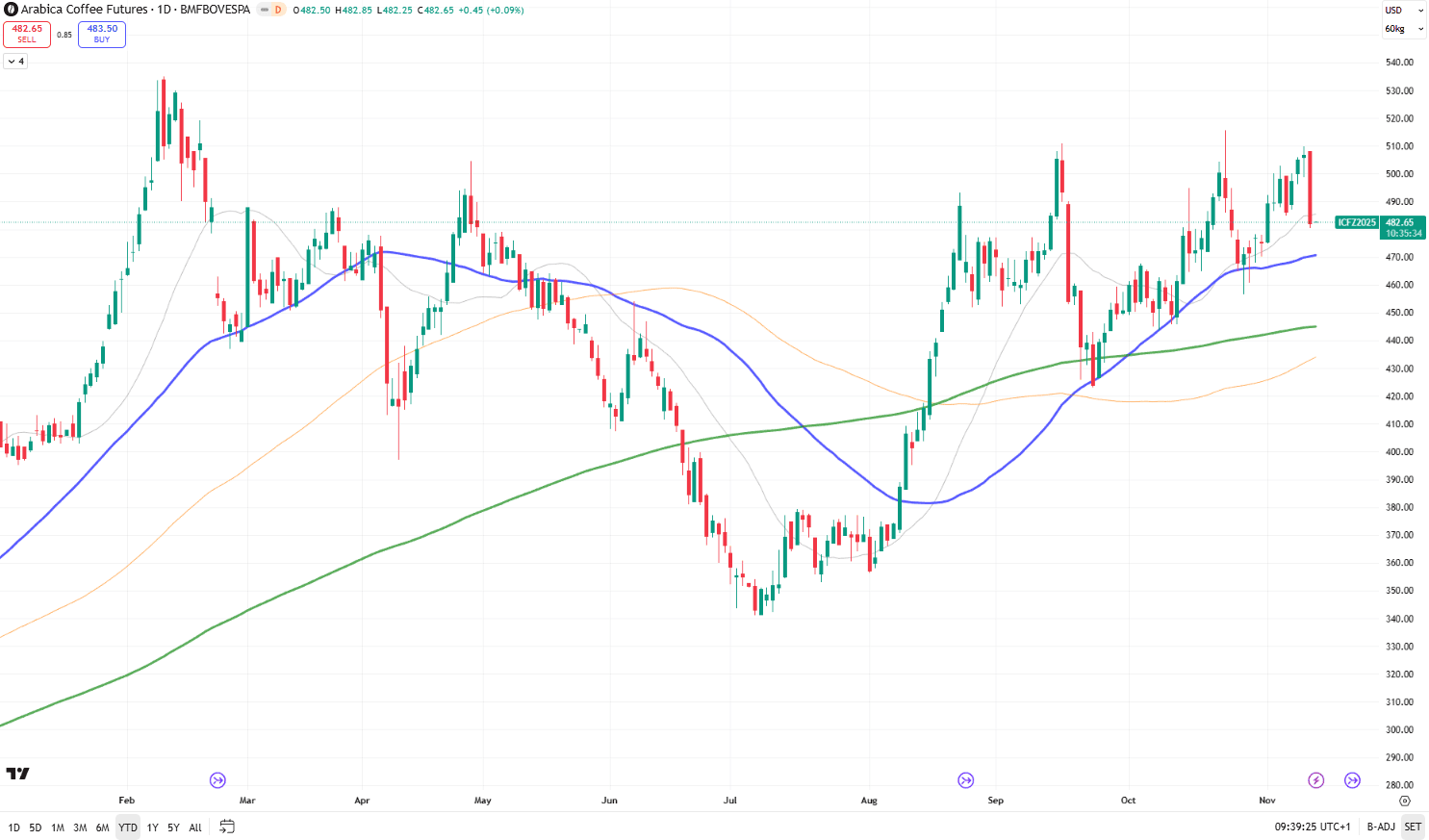Nel 2025 il caffè si è imposto come una delle materie prime più interessanti del mercato globale. L’Arabica, quotata sul contratto del Bovespa, si muove a 482 dollari per 60/kg, in rialzo del 20% da inizio anno. È il terzo anno consecutivo di crescita per una commodity che, lontano dai riflettori, ha mostrato una resilienza superiore a quella di molte asset class tradizionali.