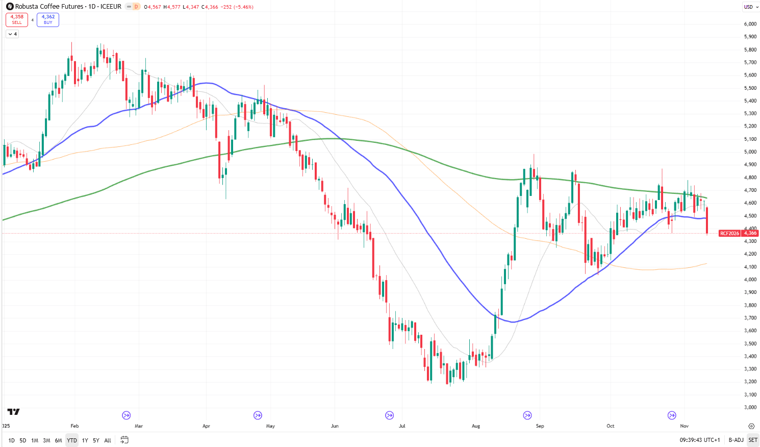 La Robusta ha seguito un ciclo diverso. Dopo aver toccato i massimi a febbraio, è entrata in un mercato ribassista di 109 sedute, con una perdita del 45% fino al 21 luglio. Da allora ha recuperato il 37%, ma il bilancio annuale resta negativo di circa il 10%.