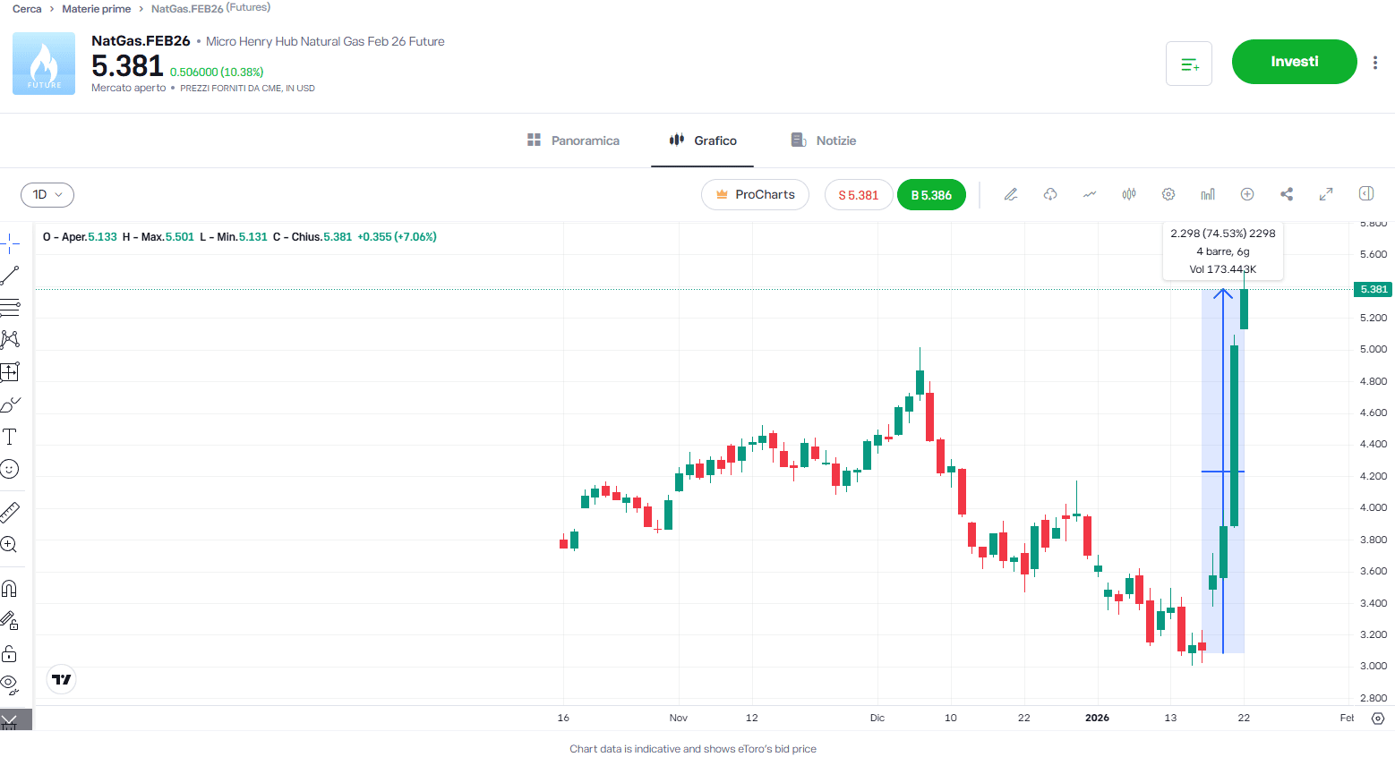 Ci avviciniamo ai giorni della merla con il gas europeo che torna a comportarsi come una variabile macro instabile, non come una semplice commodity stagionale. Il movimento delle ultime settimane è stato rapido, violento e soprattutto coerente con una narrativa che il mercato conosce bene, ma che tende a sottovalutare fino a quando non diventa prezzo. Dai minimi recenti il TTF europeo ha messo a segno un rialzo di circa il 47%, con accelerazioni marcate negli ultimi giorni. Non è un dettaglio tecnico. È il segnale che il mercato sta ricalibrando il premio per il rischio, non solo climatico ma geopolitico e infrastrutturale.