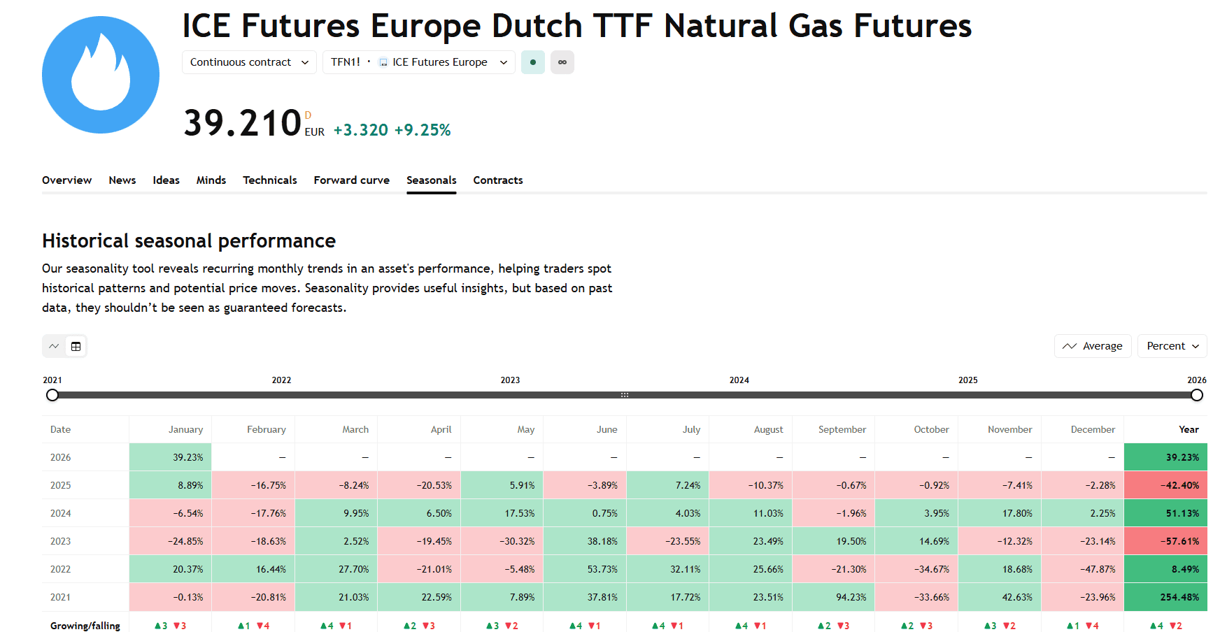 La stagionalità storica rafforza questa lettura. I dati mostrano come gennaio sia da sempre uno dei mesi più instabili per il gas naturale, sia in Europa sia negli Stati Uniti. Ma ciò che conta oggi non è solo la direzione del movimento, quanto la sincronizzazione. Quando Henry Hub e TTF accelerano insieme nel cuore dell’inverno, il mercato non sta reagendo a una semplice anomalia meteorologica. Sta prezzando un rischio comune. È in questi momenti che la stagionalità smette di essere una statistica e diventa un amplificatore di volatilità.
