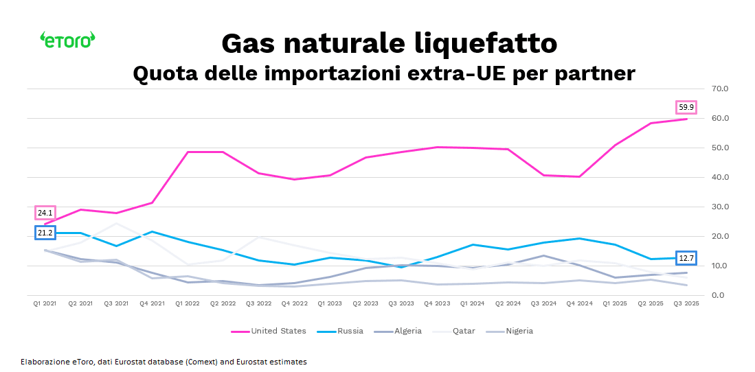 Ed è qui che il mercato europeo diventa strutturalmente più vulnerabile. Perché il gas americano non è più solo una variabile domestica. È diventato una colonna portante dell’equilibrio energetico europeo post 2022. I dati Eurostat sul GNL parlano chiaro. Nel terzo trimestre 2025 gli Stati Uniti hanno rappresentato circa il 60% delle importazioni europee di GNL, contro una quota intorno al 24% nel primo trimestre 2021. Se si combina questo dato con il peso crescente del GNL nel mix complessivo delle importazioni europee di gas, si arriva a stimare che oggi circa un quarto del gas importato dall’Unione Europea dipenda direttamente dalle forniture statunitensi. È una stima derivata, ma è una stima che fotografa un cambio di regime. L’Europa non ha semplicemente cambiato fornitore. Ha cambiato il profilo di rischio del proprio sistema energetico.