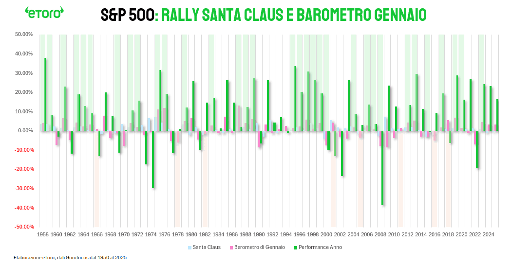 Tornando al nostro presente, il 2025 è stato un anno ibrido e fortunato. Il Rally di Santa Claus di fine 2024 aveva fallito, ma un gennaio 2025 brillante ha compensato la debolezza iniziale. Tra pochi giorni si aprirà la finestra delle sette sedute. Per il bene del portafoglio nel 2026, non serve un rialzo esplosivo del +3% o +4%. Sarebbe un segnale di surriscaldamento. Il regalo perfetto è un movimento ordinato, piccolo, compreso nella Goldilocks Zone tra 0% e 1,5%. Un eventuale gennaio positivo completerebbe il quadro, offrendo la Doppia Conferma statistica che storicamente accompagna anni con rendimenti nell’area del +16%.
