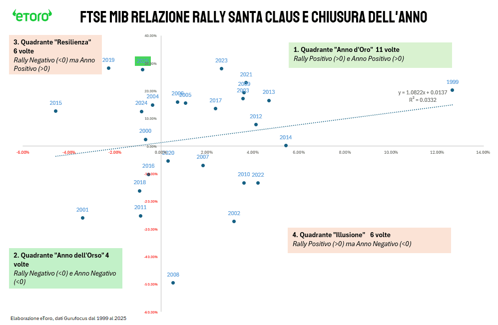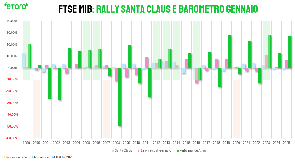 Se spostiamo lo sguardo da Wall Street a Piazza Affari, il quadro cambia radicalmente. Analizzando i 28 anni che vanno dal 1999 al 2025, scopriamo che il FTSE MIB è molto più “capriccioso” del cugino americano. Qui il Rally di Santa Claus ha funzionato solo in 15 casi su 28, ovvero il 53% delle volte. In pratica, affidarsi al solo segnale di fine anno sul listino italiano equivale quasi a lanciare una monetina.