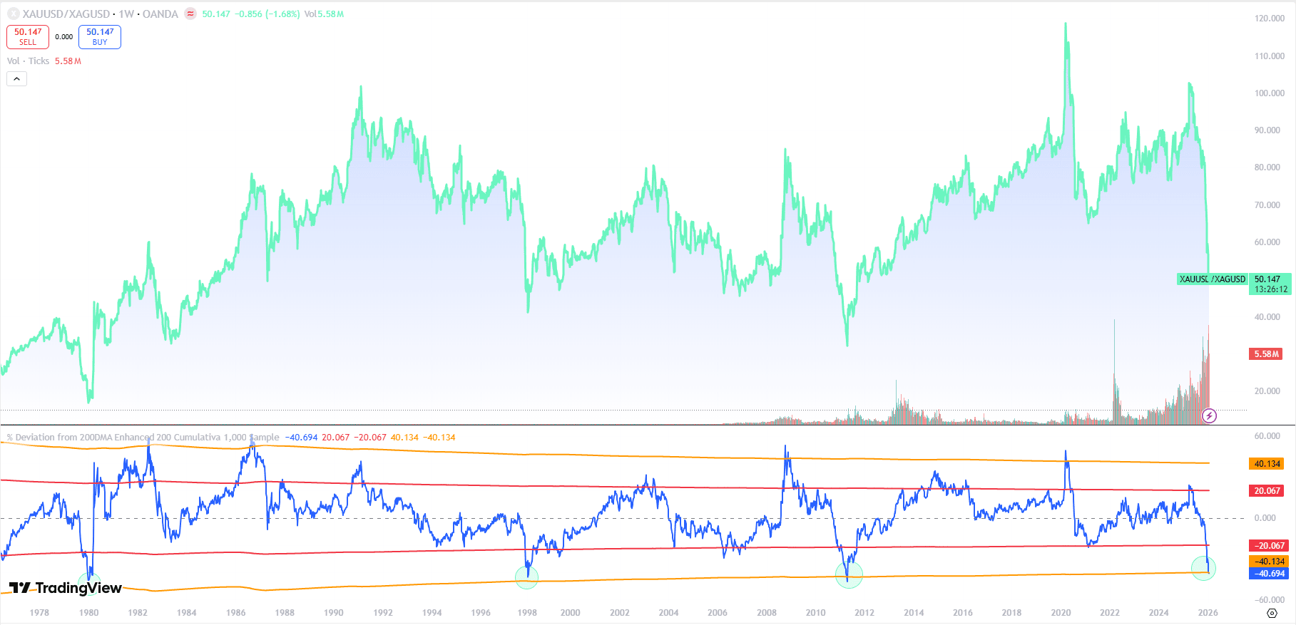 La compressione del rapporto oro/argento rafforza ulteriormente questa lettura. Su base settimanale, il ratio si è spinto nella parte più bassa del range storico, attestandosi in area 50:1 e avvicinandosi a due deviazioni standard sotto la media mobile di lungo periodo. È una configurazione che segnala tensione accumulata, non equilibrio. Queste compressioni estreme del rapporto si sono tipicamente manifestate in contesti di rotazione ciclica, domanda industriale sostenuta e flussi speculativi in aumento, più che come puro riflesso di dinamiche difensive. Anche oggi il segnale va oltre la lettura di safe haven. A questi livelli, l’argento funziona come leva di una ridistribuzione del rischio più ampia, amplificando l’esposizione a scenari alternativi, dalla crescita industriale residua all’inflazione persistente, fino al decoupling da un dollaro strutturalmente più debole. Resta però un elemento di cautela. Deviazioni così ampie dalla media storica hanno spesso preceduto fasi di pausa o meglio di correzioni violente, pur all’interno di trend di fondo ancora costruttivi per i metalli preziosi. In questo senso, l’evoluzione del rapporto diventa un indicatore chiave di timing.