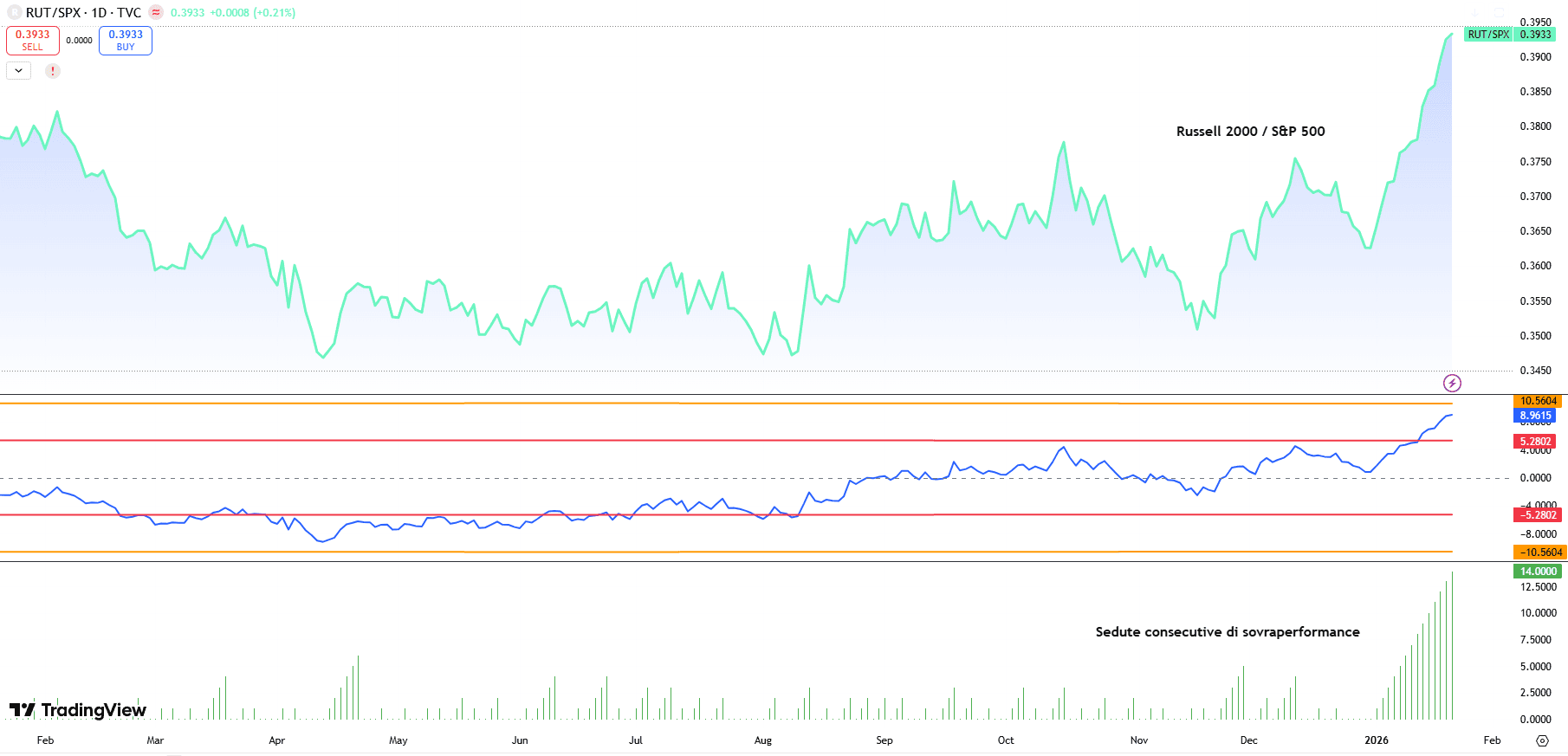 Il rapporto Russell 2000 su S&P 500 è in sovraperformance per la quattordicesima seduta consecutiva, una sequenza che non si osservava dal maggio 1996, quando il record si fermò a sedici. Anche dal punto di vista statistico il segnale è rilevante. Il movimento ha spinto il rapporto verso la parte alta del range di medio periodo, vicino a due deviazioni standard rispetto alla media a 200 giorni. Non è una condizione neutra, ma nemmeno un’anomalia isterica. È una tensione che nasce da livelli di partenza storicamente compressi, dopo anni di sottoperformance relativa delle small cap, e che riflette più la correzione di un divario accumulato nel tempo che un eccesso improvviso di entusiasmo.