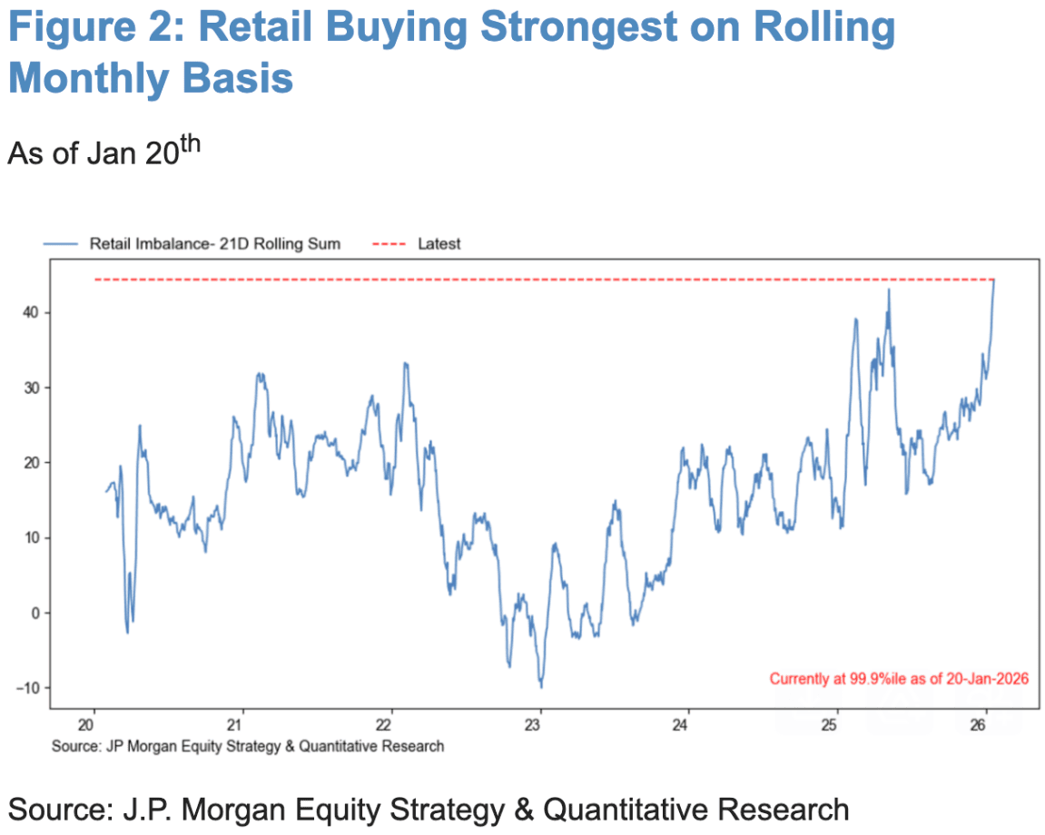 La domanda retail rafforza il quadro. JPMorgan mostra un’attività record su base mensile rolling, al 99,9 percentile. 12,9 miliardi in una settimana non sono retail curioso, sono retail strutturalmente coinvolto. Il mercato non è privo di euforia, ma nemmeno cieco. Le rotazioni verso small cap, titoli ad alto beta e segmenti volatili non sono un all in, sono una redistribuzione del rischio lungo la curva delle probabilità.