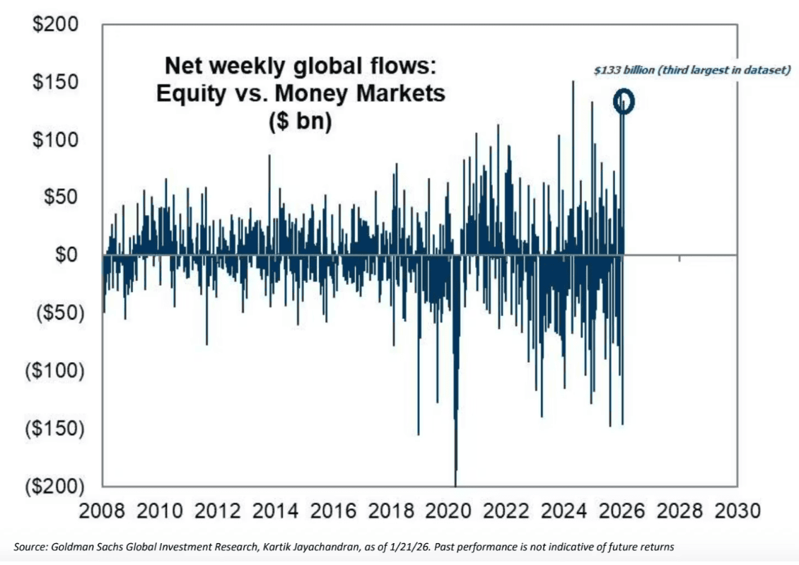 Ma entriamo nel cuore comportamentale. L’equity put call ratio a 0,41 è vicino ai minimi dell’anno e ai livelli dello scorso maggio. Storicamente è una zona che segnala ottimismo elevato, se non compiacenza. Ma qui entra il bias più comune. Livelli bassi di put call ratio non causano inversioni, indicano semplicemente che il mercato sta smettendo di pagare per la protezione. Questo è coerente con flussi massicci dal cash verso le azioni. Goldman parla di 133 miliardi di dollari, terzo dato più alto della serie storica. Non è un flusso tattico, è una riallocazione di portafoglio.